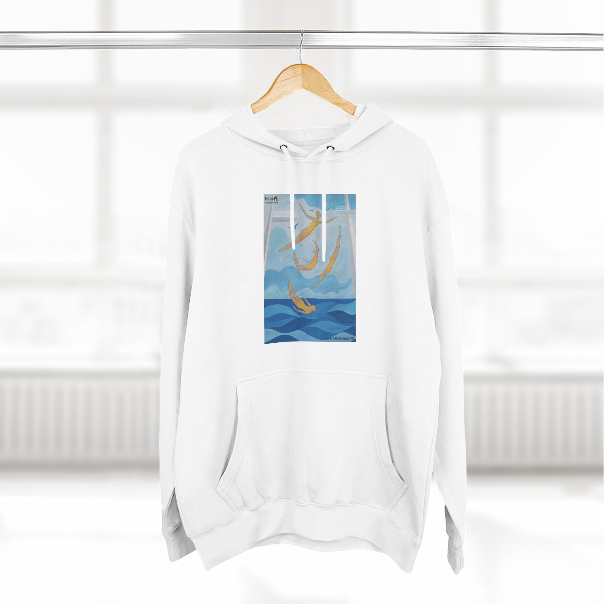 This artwork is dedicated to Kherson and the sea — where seagulls soar high and the sun dances on the waves. The diving girls represent freedom, strength, and lightness. They embody motion, energy, and a deep love for water and life.